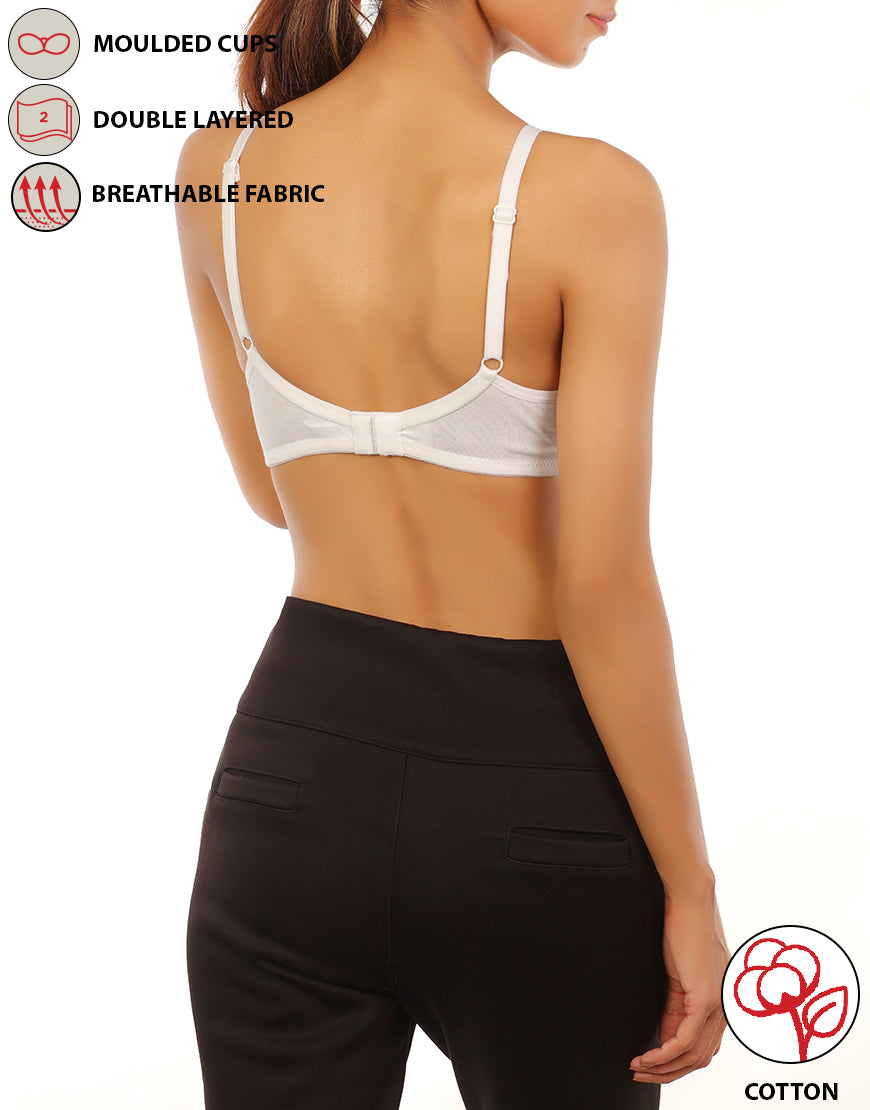 Du wirst diesen BH aus elastischer Baumwolle wegen seines Komforts und seiner Unterstützung lieben. Er fühlt sich an, als würdest du nichts tragen, da er keine einschneidenden Bügel hat, aber dennoch dank des doppellagigen Materials, das sich sehr weich auf der Haut anfühlt, vollständige Unterstützung bietet. Die Cups bieten eine 3/4-Abdeckung.