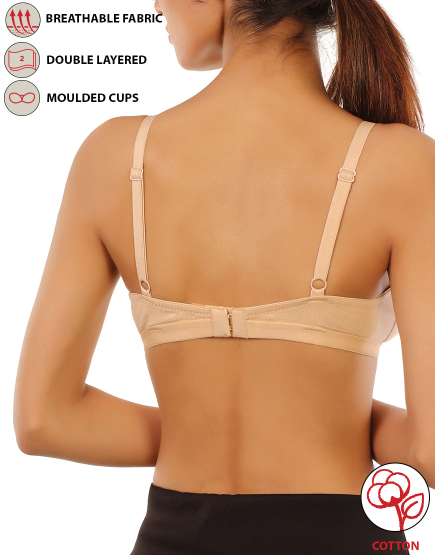 Ein unverzichtbarer Alltags-BH aus Baumwolle. Die doppellagigen Cups sorgen für eine glatte Oberfläche und sind unter der Kleidung unsichtbar. Die Baumwolle macht den BH atmungsaktiv und komfortabel, besonders im Sommer. Er bietet vollständige Abdeckung für die Brust ohne Überschüssiges. Es handelt sich um einen Full-Coverage-BH mit einer zusätzlichen dritten Schicht zwischen den beiden Lagen unter dem Cup und an den Seitenflügeln, um zusätzlichen Halt für die Brust zu bieten.