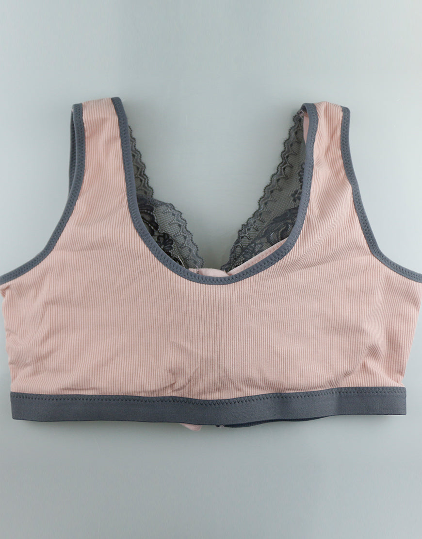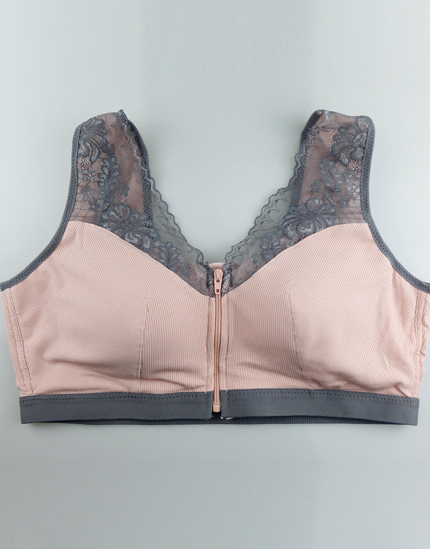 Dies ist ein postoperativer BH aus geripptem Stoff mit einem grauen Farbakzent. Er hat ein breites Band, das eine gute Unterstützung bietet. Der Frontreißverschluss erleichtert das An- und Ausziehen. Die graue Spitze am Ausschnitt verleiht dem BH Eleganz.